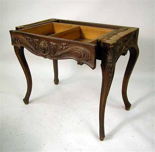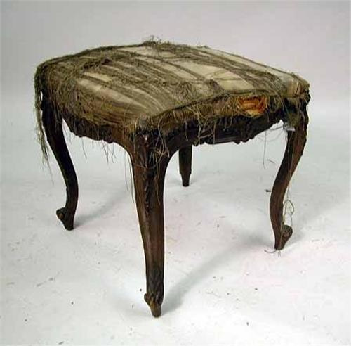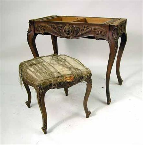 American. Lacking top. 29"h x 35"w x 20"d. Together with a Louis XV style carved walnut stool. Distressed. 18"h x 18"w x 18"d. 2 pieces.