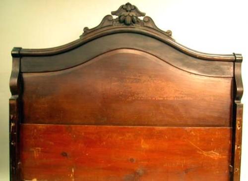 A VICTORIAN CARVED MAHOGANY BEDSTEAD; American, with acorn carved serpentine headboard with floral carved rounded headboard and shaped rails (losses and imperfections to surface) 4'9"h x 4'9 1/2"w x 6'8"l