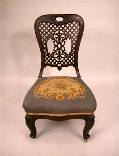 A VICTORIAN CARVED WALNUT SLIPPER CHAIR; American, with ruffle-carved crest, lattice splat, needlepoint seat and acanthus-carved cabriole legs on casters