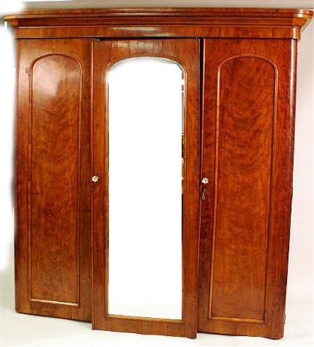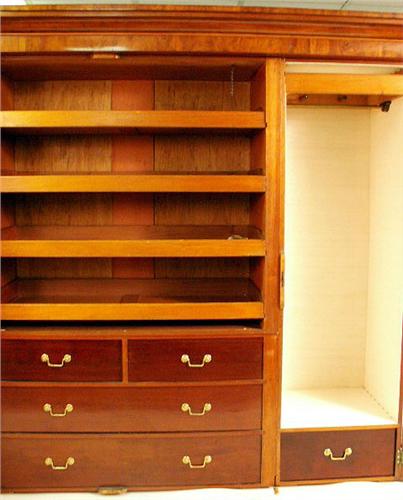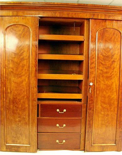 English, the doors opening to sliding shelves and closet space. Some wear. 7`h x 6`6"w x 24"d.