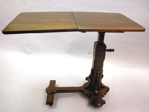 A VICTORIAN FIGURED WALNUT ADJUSTABLE READING TABLE; English, the hinged rectangular top above a faceted standard shaped base and casters 30"h x 34"w x 20"d