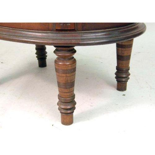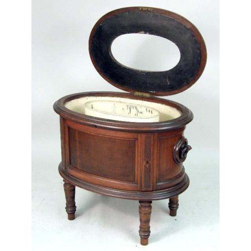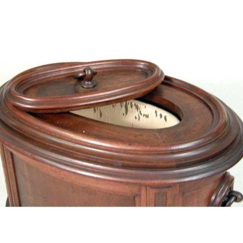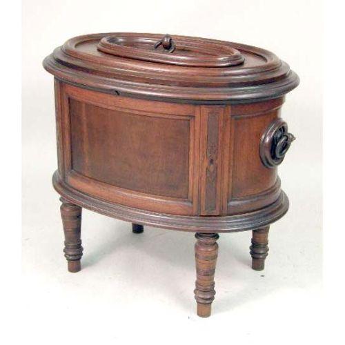 A VICTORIAN FIGURED WALNUT CELLARETTE<BR><BR>Of impressive size, the concentric oval top fitted with a swiveling ring handle, opening to a divided white-painted tin lined interior, turned tapering legs ending in peg feet, 31"h x 36"w x 14"d