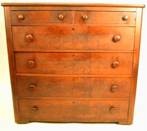 A VICTORIAN FIGURED WALNUT CHEST-OF-DRAWERS; American, the rectangular molded top above an arrangement of two short drawers with four long drawers below 44 1/2"h x 47"w x 18"d
