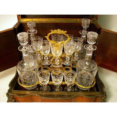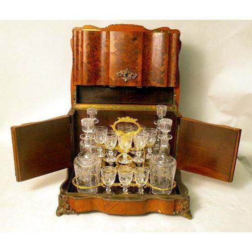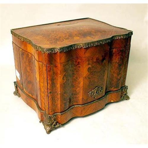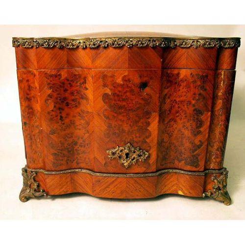 A VICTORIAN GILT-METAL MOUNTED TRAVELING DRINKS CABINET<BR><BR>Continental, the interior fitted with four decanters and three glasses. Lacking glasses. 10 1/4"h x 13 1/2"w x 10 1/4"d