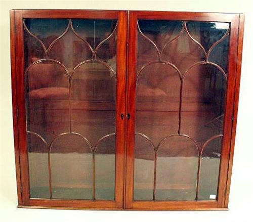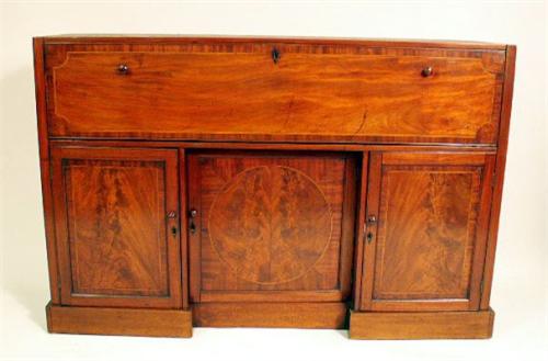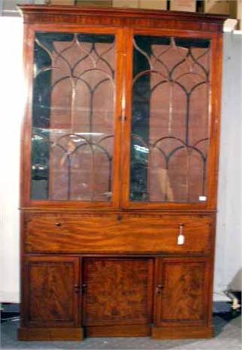 English, in three parts, the fall board opening to an arrangement of short drawers, pigeonholes, and prospect doors, above cupboard doors opening to shelves. Some repairs. 8`4"h x 5`4"w x 16"d.