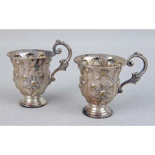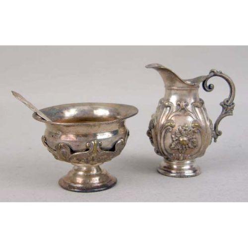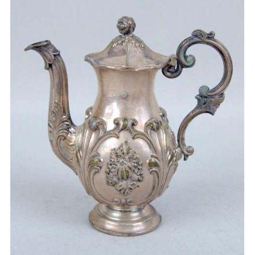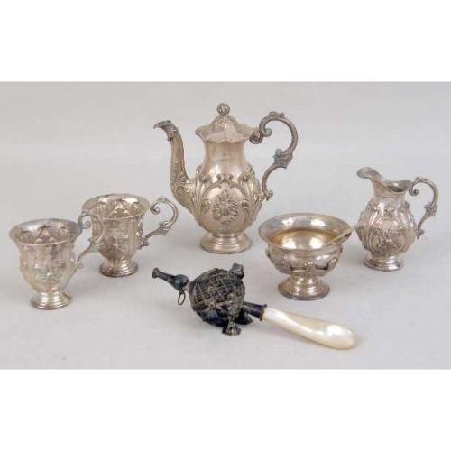 A VICTORIAN MOTHER-OF-PEARL HANDLED SILVER BABY RATTLE<BR><BR>6"l, Together with a Victorian child`s silver on copper five piece tea set, comprising: tea pot, open sugar bowl, cream jug, and two cups, melon form finial, chased floral and foliate decoration, tallest, 4-3/4"h. 6 pieces