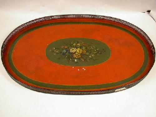A VICTORIAN OVAL, SCARLET AND GREEN FLORAL-DECORATED TOLE TRAY; English, with a reticulated gallery and ring handles (some repairs and losses) 31"w x 19"d