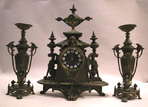 A VICTORIAN PATINATED METAL THREE PIECE GARNITURE SET; With animal figure on paw feet, (as found condition) 16"h