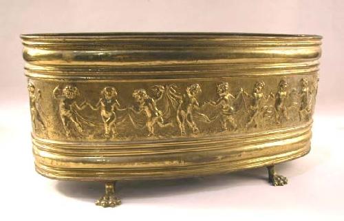 A VICTORIAN REPOUSSE BRASS JARDINIERE; decorated all over with cherubs, losses. 11"h x 22"w x 9"d