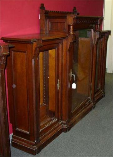 A VICTORIAN ROSEWOOD INLAID CARVED WALNUT BOOKCASE; American, the projecting center section with quatrefoil-decorated frieze on colonettes, the breakfronted bookcase doors below, formerly built-ins, losses, 5'2 1/2"h x 7'6"w x 19 1/2"d