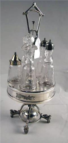 A VICTORIAN SILVER PLATED CASTER SET; Five glass bottles, engraved leaf and berry border, allegorical head feet, good condition 17"h