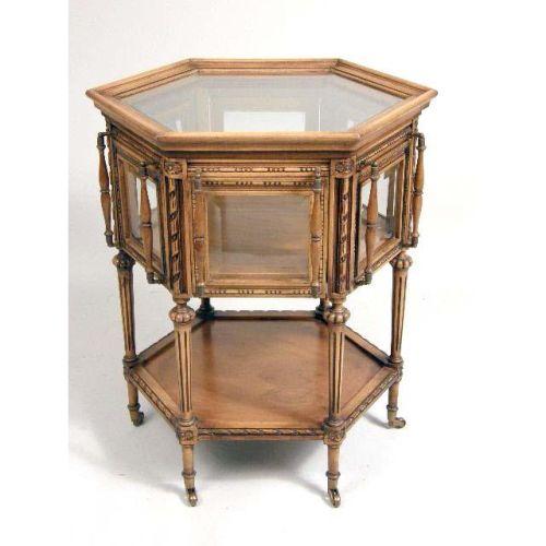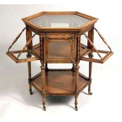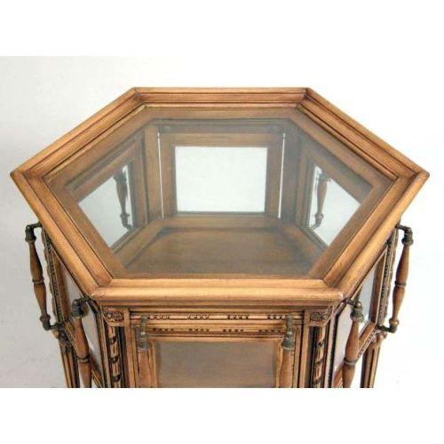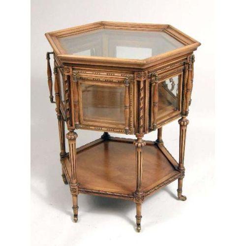 A VICTORIAN STYLE CARVED WALNUT OCTAGONAL TEA TABLE<BR><BR>The hexagonal top inset with a glass panel, the conforming frieze with a glazed drop-tray at each side, and the whole raised on turned tapered fluted legs joined by a hexagonal platform stretcher, 29"h x 25"dia.