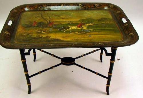 A VICTORIAN TOLE TRAY ON FAUX BAMBOO STAND; Pierced with handles centering a fox hunting scene, losses, 30"w x 22"d