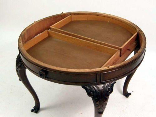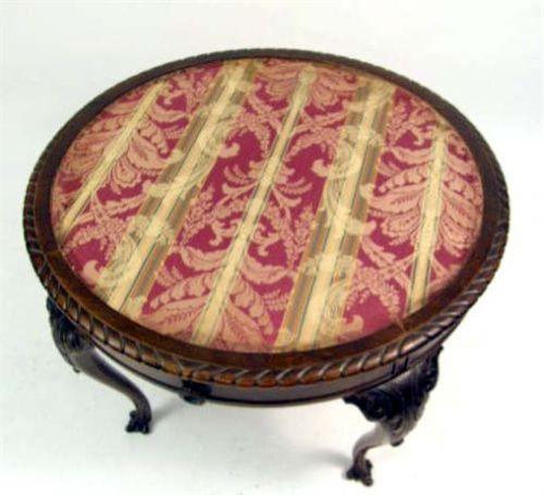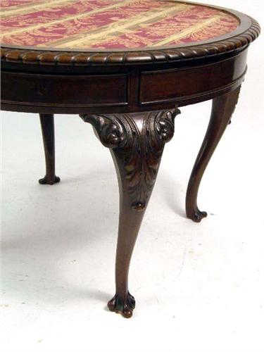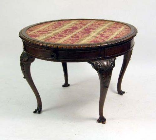 The top with inset fabric and glass surrounded by a gadrooned border, a frieze with two drawers above carved cabriole legs. 26"h x 3`dia. Missing one drawer pull, removable top needs adjustments.