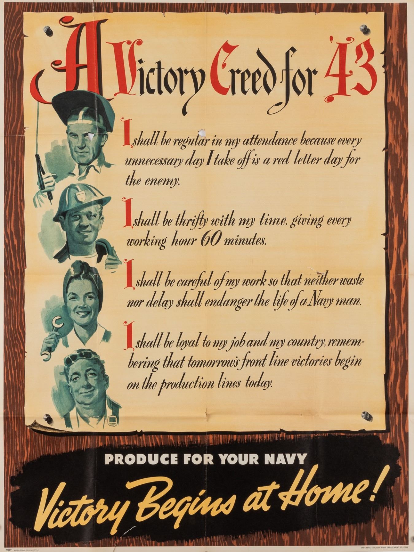 A Victory Creed for 43 - Produce for your Navy - Victory Begins at Home!', Incentive Division, Navy Department SC-1-35M, Einson-Freeman Co., Inc., 40 x 30 inches. Mailing folds, loss at mailing folds, two 2.5-inch tears, and minor splits.