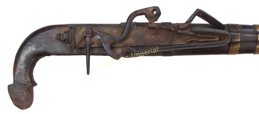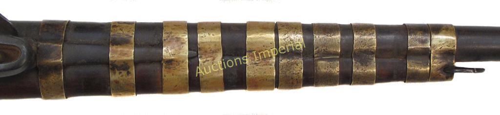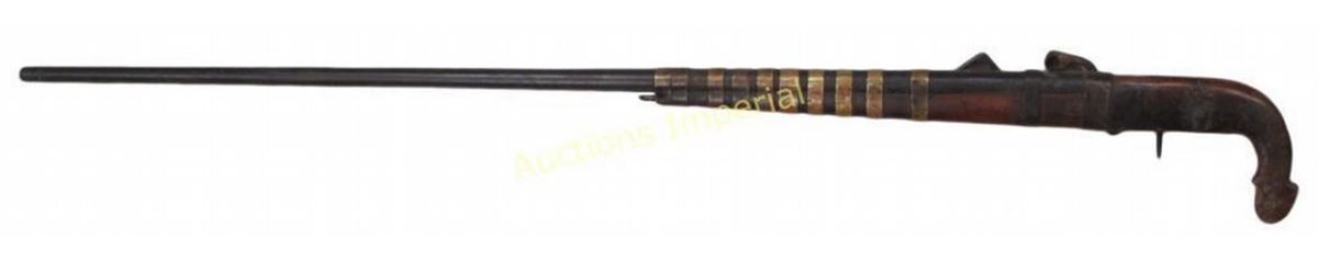 Of typical Montagnard form with angled butt, the stock of figured hardwood, the barrel likely Chinese workmanship, retained by a number of brass bands. Functional lock of characteristic local make with all parts exposed. Late 19th-early 20th century. Light wear. Overall length 92.9 cm.