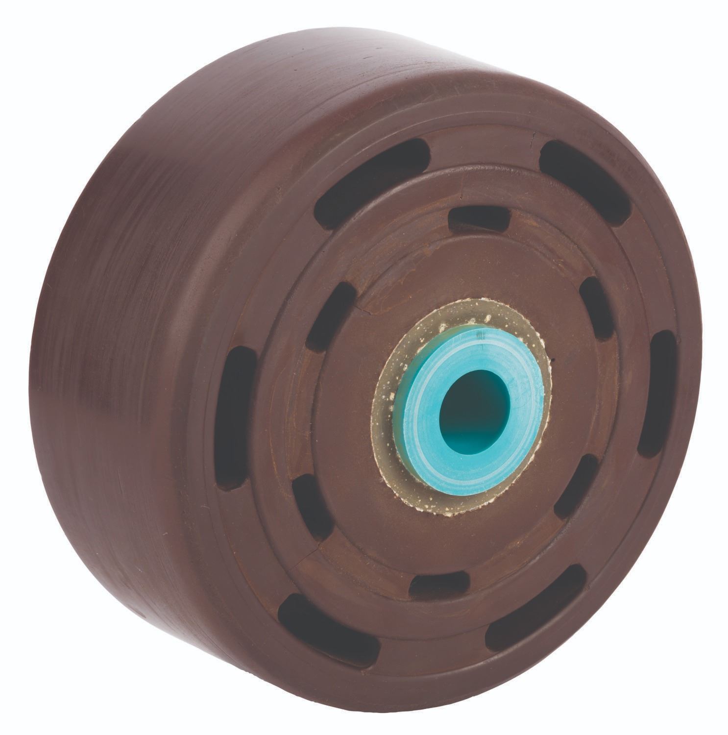 (Disneyland, 1989-2020s) A Splash Mountain attraction vehicle wheel. This is one of four visible wheels that help keep the attraction vehicles on track. Comprised of a durable rubber and synthetic plastics, the wheel was removed during a previous rehabilitation. Measuring 10.25" in diameter and 4.5" wide, the wheel displays in very good condition with distress cracks to the rubber and retaining traces of minerals from water from Park use.