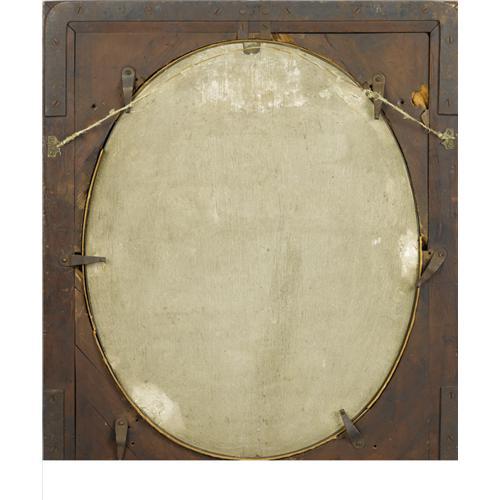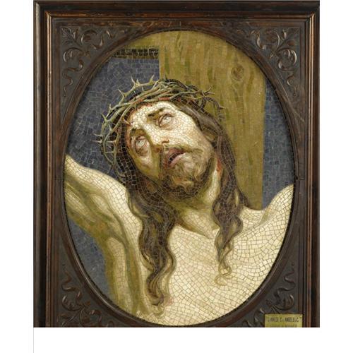 <B>A Superb Venetian Mosaic Panel: <I>The Crucified Christ</B></I></B></I><BR><BR>Gianese Cav. Angelo & Co., Venice, Italy<BR>Nineteenth Century<BR>Mosaic on concrete<BR>Marks: affixed plaque: <I>GIANESE CAV. ANGELO & CO., STUDIO DI MOSAICO, VENEZIA</B></I><BR>30 in. high x 24.5 in. wide overall<BR><BR>An oval mosaic depiction of the Crucified Christ with crown of thorns, framed.<BR>