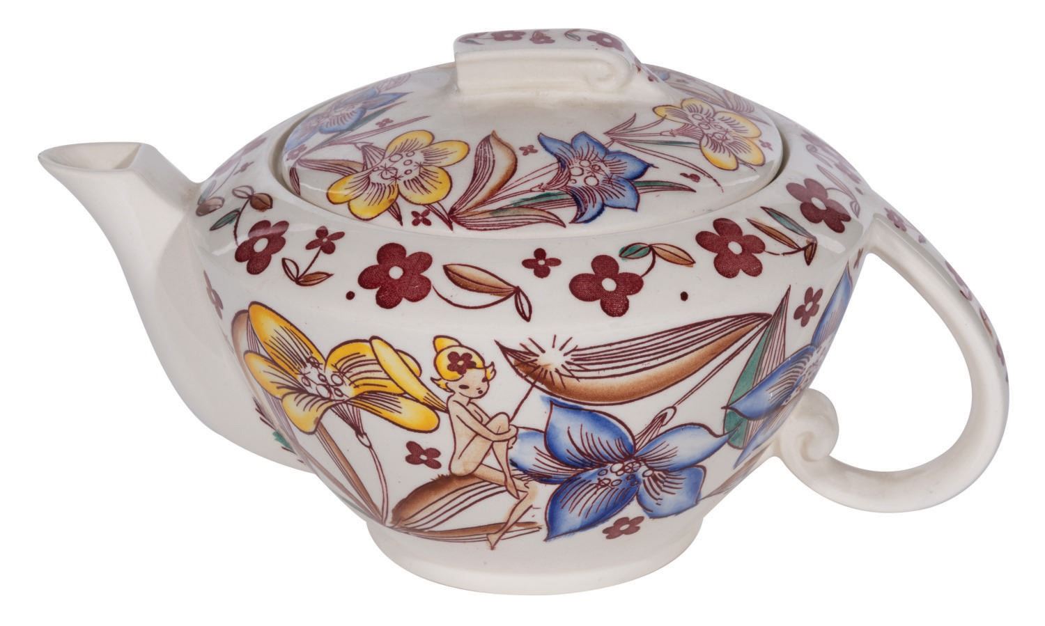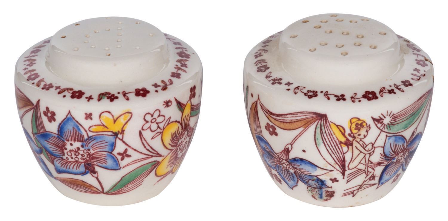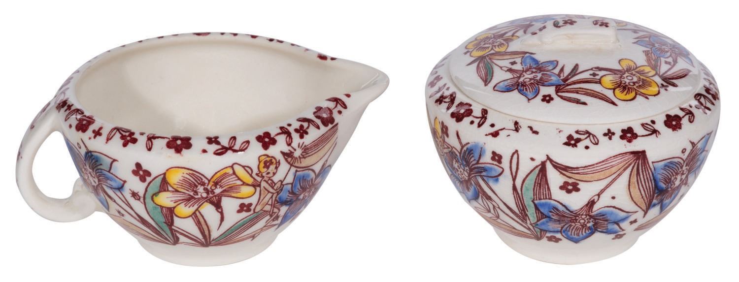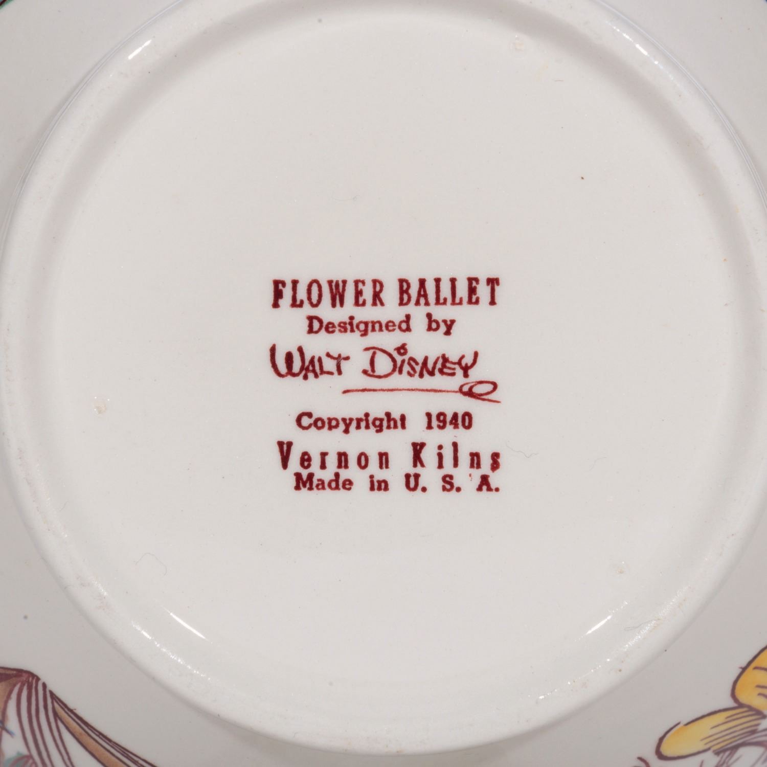 (Vernon Kilns, 1940) A stunning (60) piece tableware set by Vernon Kilns, all in the Fantasia "Flower Ballet" pattern. The pattern was designed by Disney Studio Artist Gyo Fujikawa. Included are (8) 10.5" dinner plates, (8) 8.5" plates, (8) 6.5 inch plates/saucers, (7) 3' egg cups, (6) 8 oz. cups with handles, (1) 3.5" sugar bowl with lid, (1) set salt and pepper shakers, (1) 3" regular creamer, (1) 8.5" casserole dish with lid, (1) 7.5" teapot with lid, (1) 8.5" tall coffee pot with lid, and (1) 7.5" butter dish with cover, for a total of (61) pieces. The sugar bowl exhibits light crazing. The coffee pot has a .25" hairline crack on the rim. (1) egg cup has two chips in the rim less than .25" each, and another has a .25" chip on the base. (1) 8 oz. cup has three large hairline cracks visible. (2) of the 8.5" plates exhibit wear from display. Overall, the set is in fine to very fine condition, a truly rare find.
