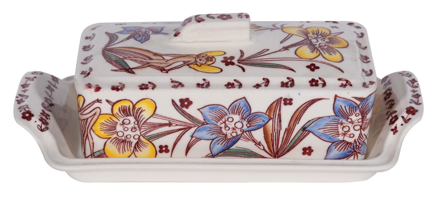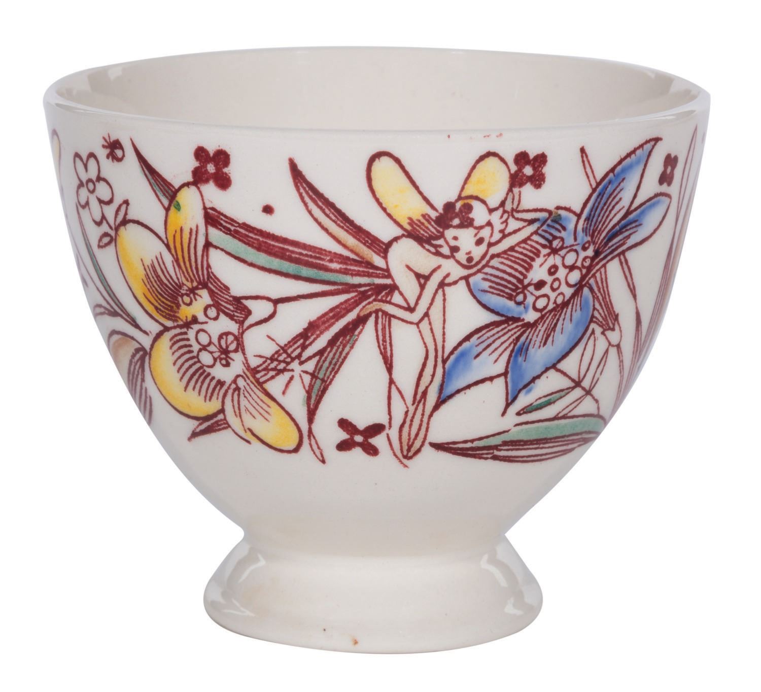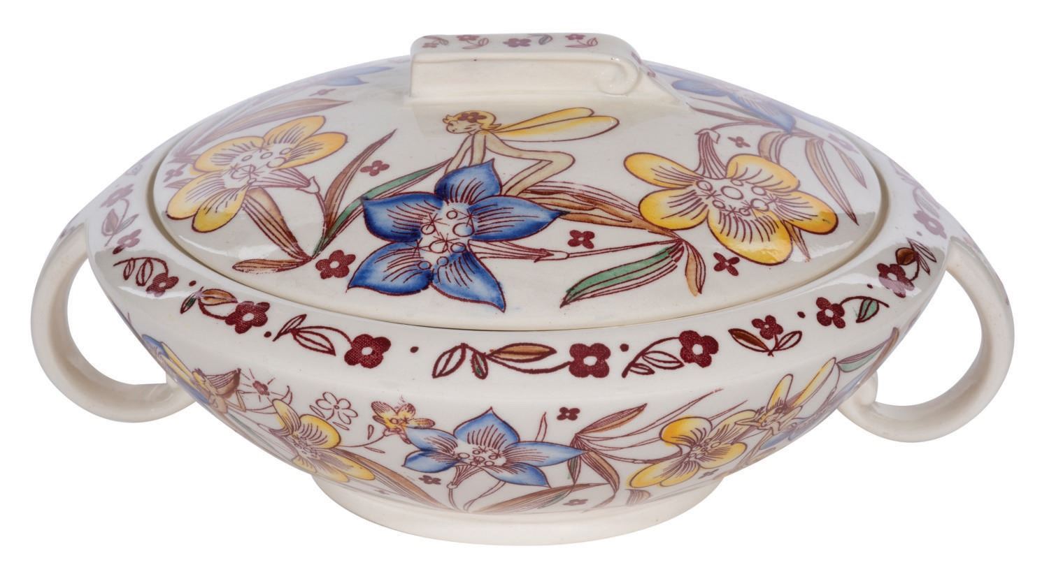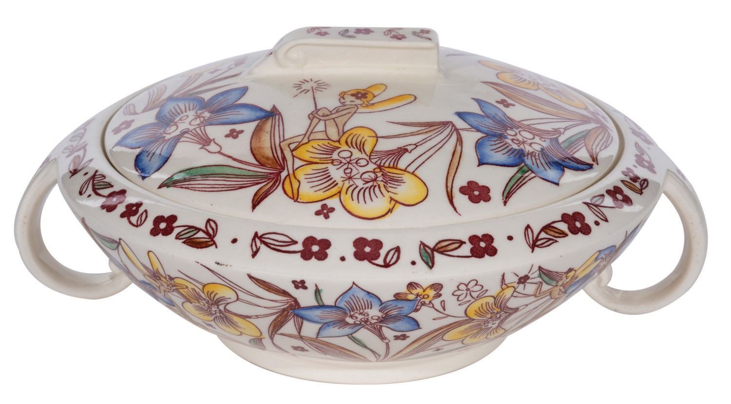 (Vernon Kilns, 1940) A stunning (60) piece tableware set by Vernon Kilns, all in the Fantasia "Flower Ballet" pattern. The pattern was designed by Disney Studio Artist Gyo Fujikawa. Included are (8) 10.5" dinner plates, (8) 8.5" plates, (8) 6.5 inch plates/saucers, (7) 3' egg cups, (6) 8 oz. cups with handles, (1) 3.5" sugar bowl with lid, (1) set salt and pepper shakers, (1) 3" regular creamer, (1) 8.5" casserole dish with lid, (1) 7.5" teapot with lid, (1) 8.5" tall coffee pot with lid, and (1) 7.5" butter dish with cover, for a total of (61) pieces. The sugar bowl exhibits light crazing. The coffee pot has a .25" hairline crack on the rim. (1) egg cup has two chips in the rim less than .25" each, and another has a .25" chip on the base. (1) 8 oz. cup has three large hairline cracks visible. (2) of the 8.5" plates exhibit wear from display. Overall, the set is in fine to very fine condition, a truly rare find.