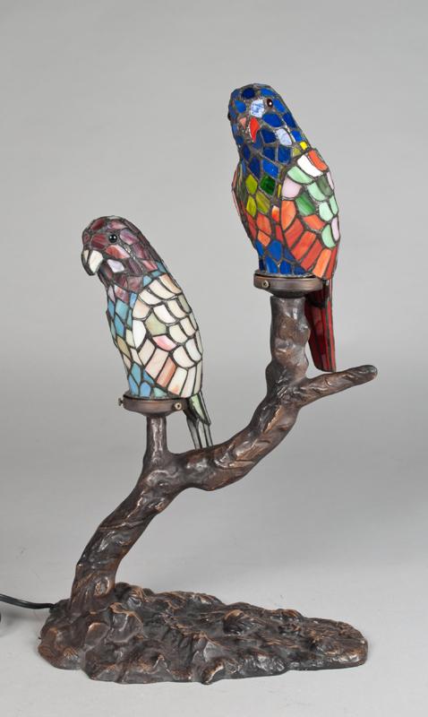 Depicting two parrot shades atop a branch form base. 21.75" H.