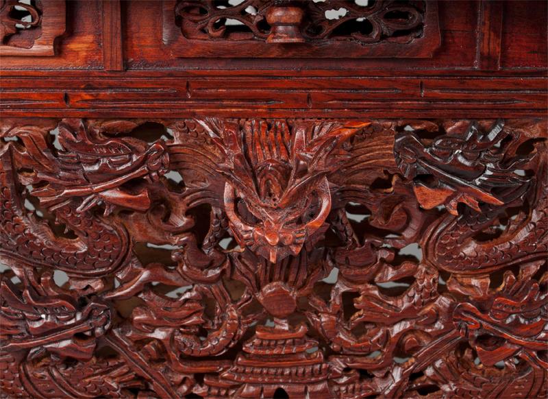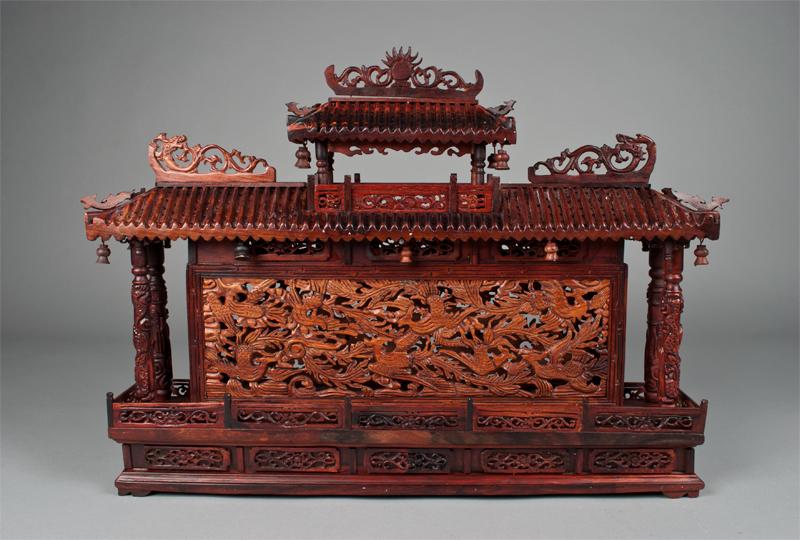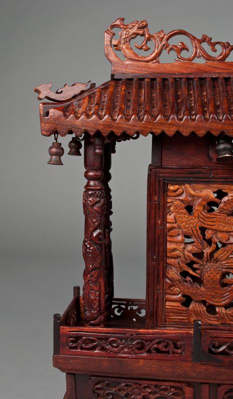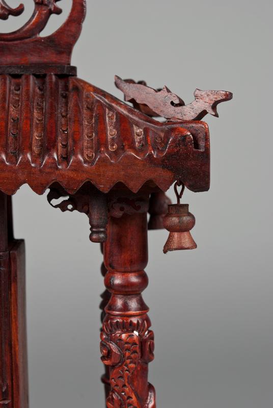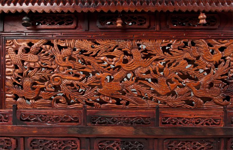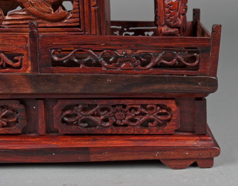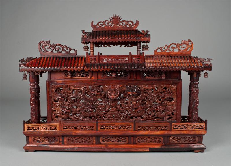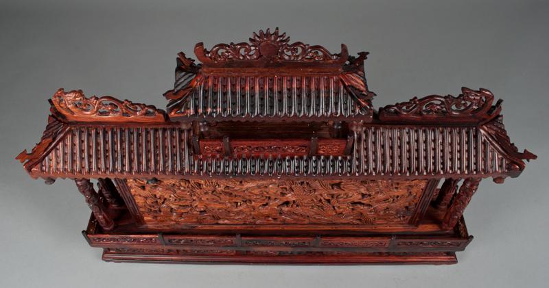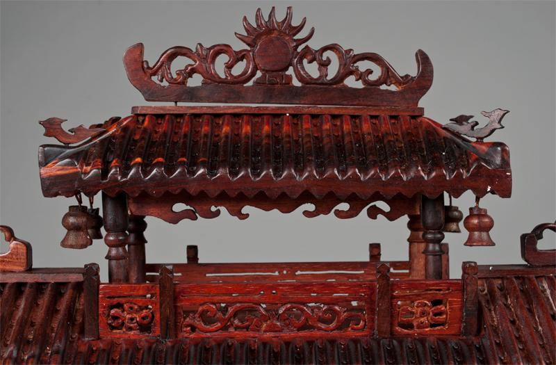 Boxwood wall finely carved to depict openwork with large protruding dragon head with smaller protruding dragon heads to one side, other side finely carved with openwork to depict numerous Phoenix birds. Openwork railing with scrolling designs, and rests on four columns to either side with dragon carvings. Faux "bells" hang throughout and top with openwork railing followed by miniature dragons on eight corners. Carved crest adorns very top with openwork and what appears to be a sun carving. 16.25" H x 21.75" W. Excellent condition, 20th century. Private collection Royal Oak, Michigan.