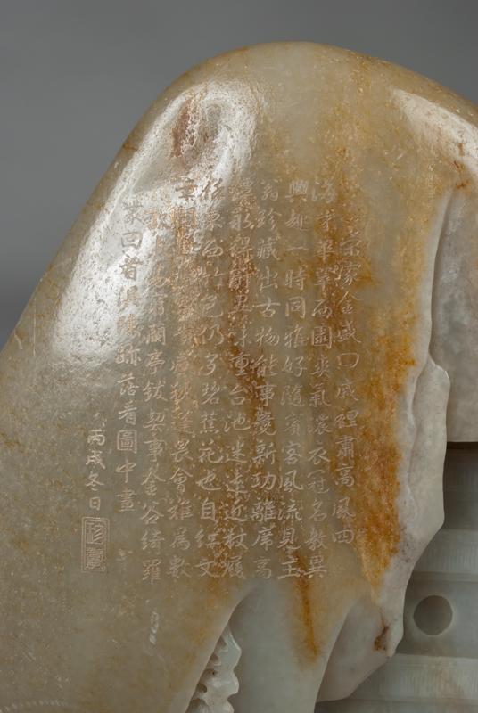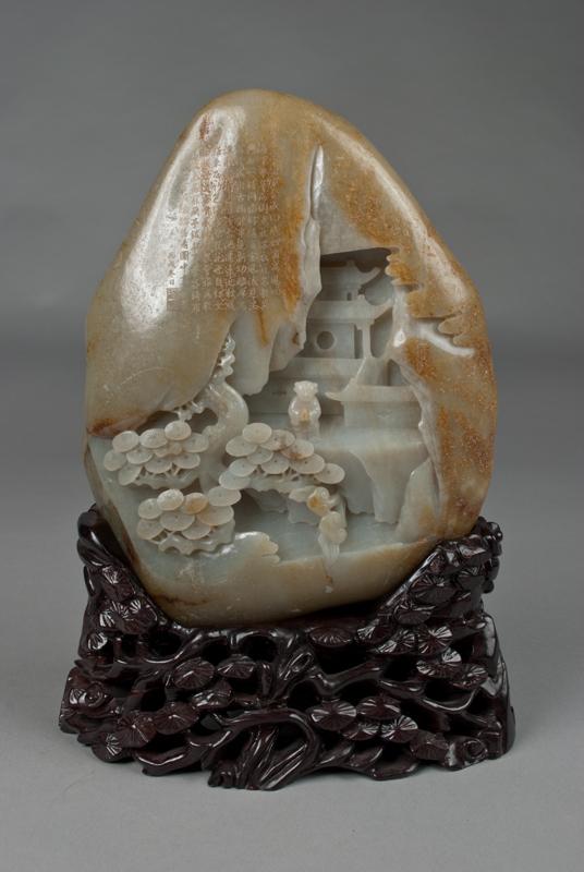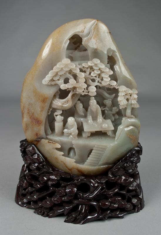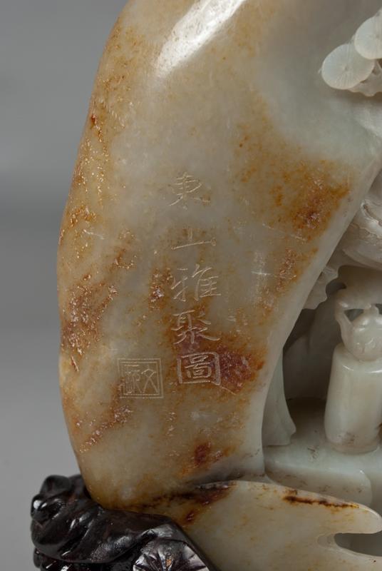Finley carved to depict a scholar at his table with attendants around him under a pine tree, the stone a celadon tone with russet inclusions and a very fine polish, the left front side of the boulder with calligraphy and a seal mark, the back of the boulder with several lines of calligraphy and seal mark, the jade very large measuring 9.75"H x 7.75"W, and 11.75"H x 8.25"W with stand. Very fine carving.