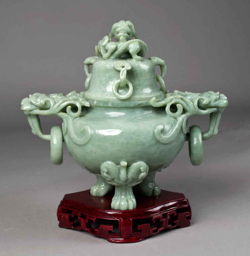 Covered censer with loose rings and dragon handles and lid, standing on three pawed and dragon head feet. On custom carved wood stand and with custom fitted box. 9" H x 9.5" W, not including the stand. One handle wear scrolling is, with small loss. Circa 20th century.