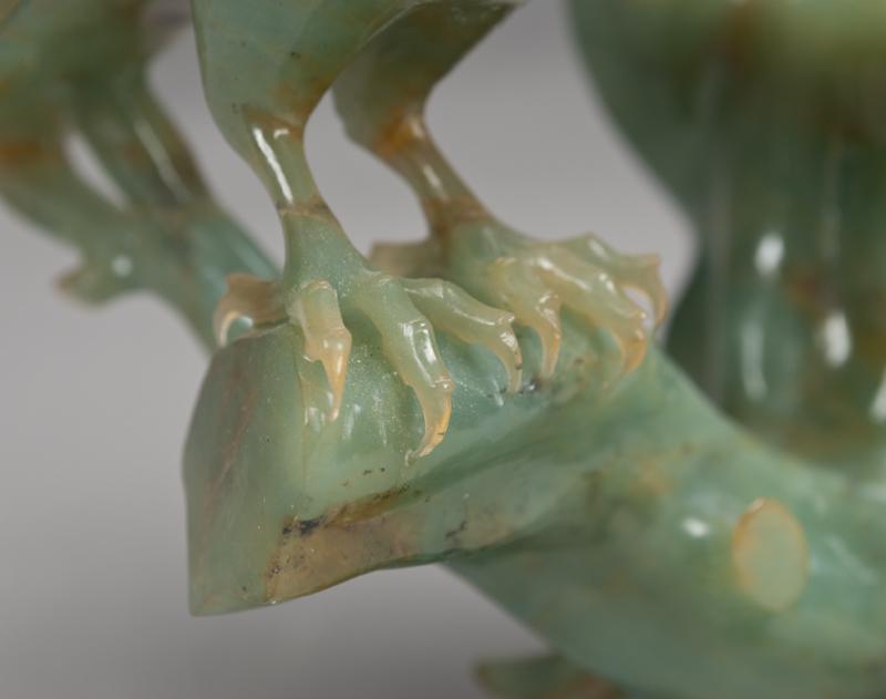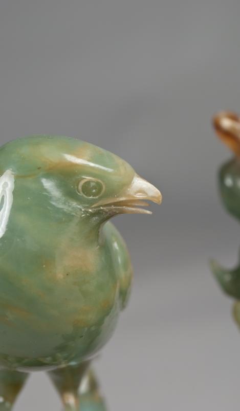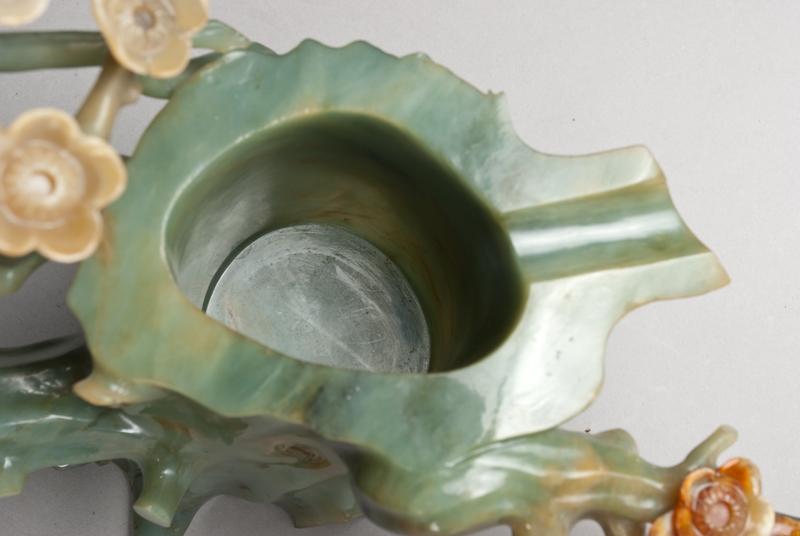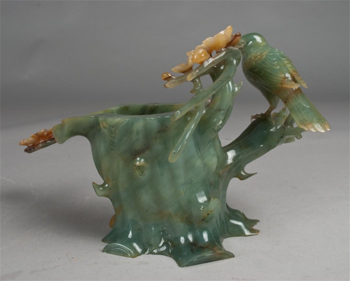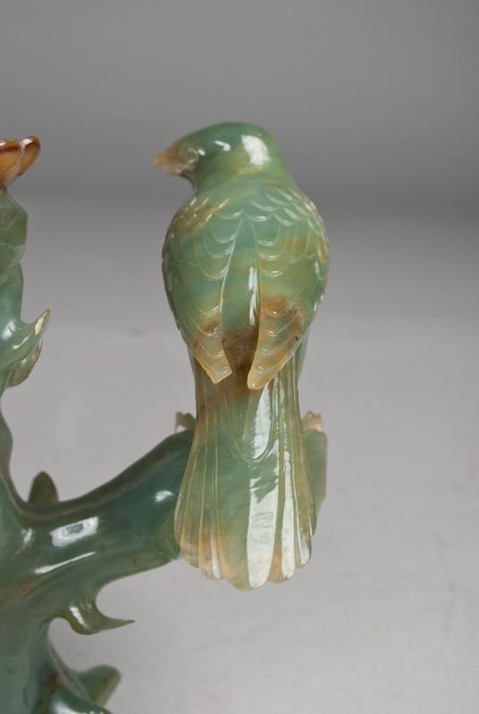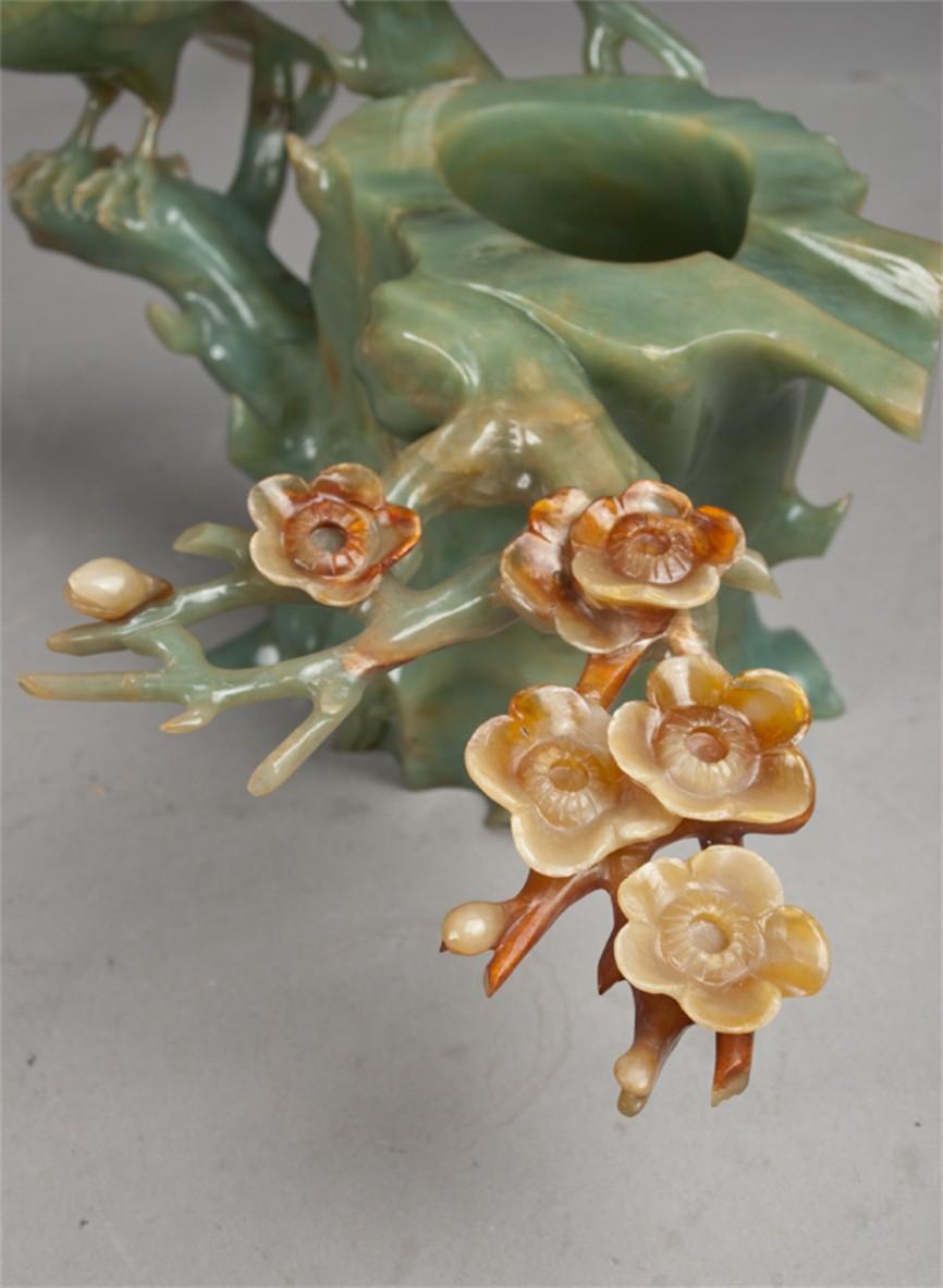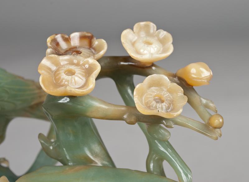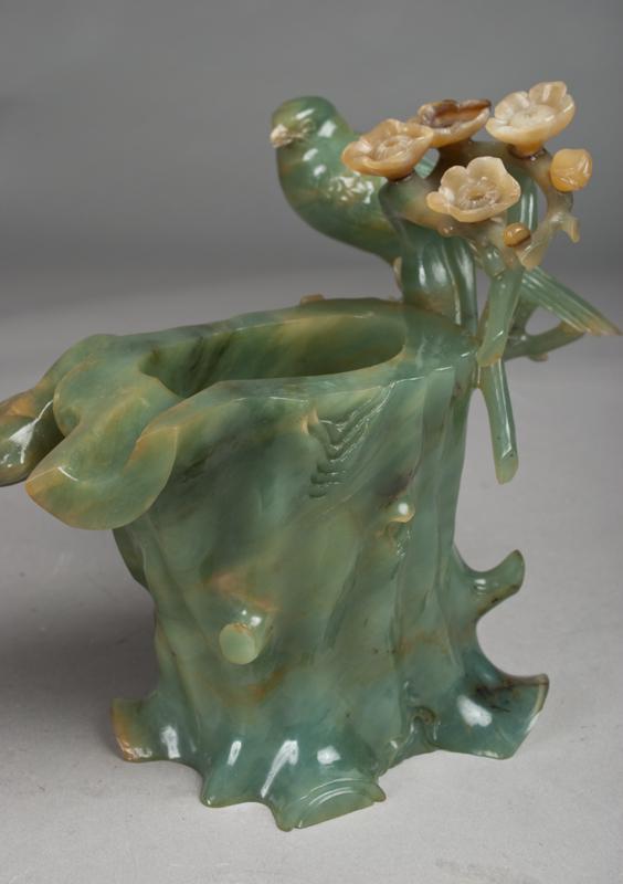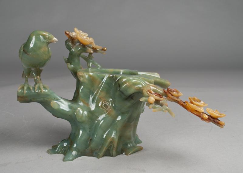 Finely carved in the shape of a tree trunk with extended branches, and finely carved flowers highlighted in russet, one branch with finely carved bird depicting open talons, open beak with tongue, the stone a green celadon color with russet highlights, 11.5"W X 6.5"H and one the finest carvings we have seen.