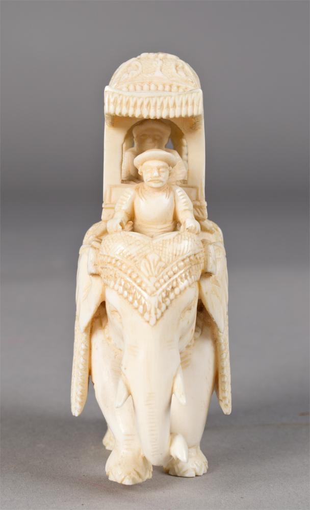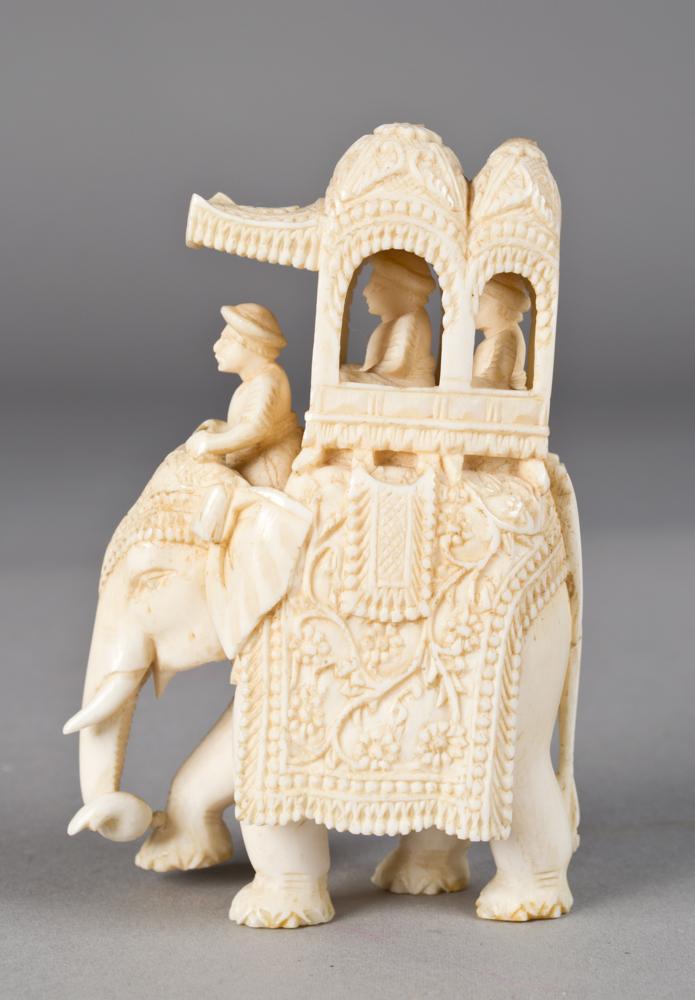 Very finely carved to depict an elephant adorned with decorative head gear and saddle, with a mahout giving two passengers a ride. 4" H x 2 & 5/8" L x1.5" W. Circa late 19th/early 20th century.