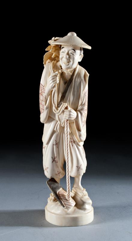 Finely carved to depict a rice farmer holding a rice basket with realistic details and painted highlights, the base signed with red character mark. 10" H, circa late 19th/early 20th century.