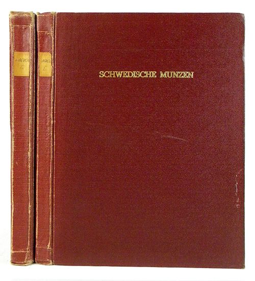 Hess, Adolph. SAMMLUNG DES HERRN L.E. BRUUN IN KOPENHAGEN. SCHWEDISCHE MÜNZEN. I. TEIL: VOM MITTELALTER BIS GUSTAV RUDOLPH. II. TEIL: VON CHRISTINE BIS ZUR GEGENWART. Frankfurt am Main, 18.-19. Mai und 26.-27. Oktober 1914. Two volumes. 4to, somewhat later maroon cloth, gilt; spine labels; original printed card covers bound in. (6), 73, (1); (4), (75)-168, (2) pages; 2347 lots; 80 fine plates of coins. Bindings a bit worn, with tear to rear cloth of first volume. Contents near fine. A very important collection of medieval and modern Swedish coins. The outbreak of World War I prevented the second part of the sale from taking place and this portion of the collection was subsequently sold privately. Clain-Stefanelli 7341 & 11644. Grierson 307.
