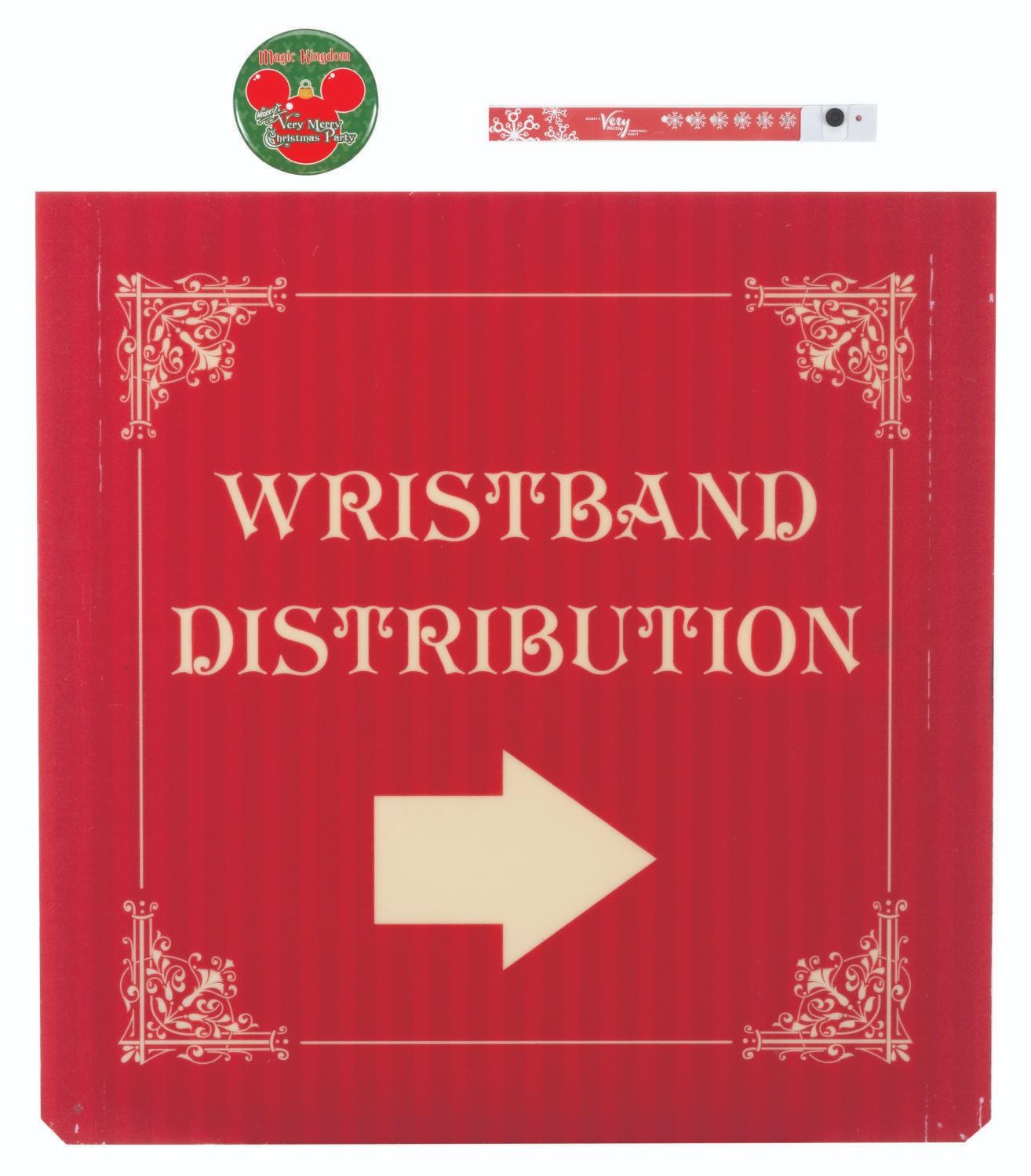 (Walt Disney World, 2000s) A sign for Wristband Distribution for Mickey’s Very Merry Christmas Party at the Magic Kingdom. Also included is a 3" button, and three wristbands from the event. Measuring 19.75" x 19.75" the acrylic sign displays in good condition with spots of wear from Park use.