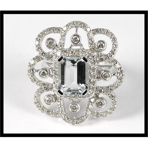 This elegant floral design lady's 18K white gold ring contains with an aquamarine set in the center weighing approximately 2.30 carats. This sparkle aquamarine measures in 7/16 inches long by 5/16 inches wide. There are 98 round diamonds that have an estimated total weight of 1.60 carats are set on this beautiful ring. The surface of the ring measures 1 inch long and 1 1/8 inches wide. It weights 10.50 grams.