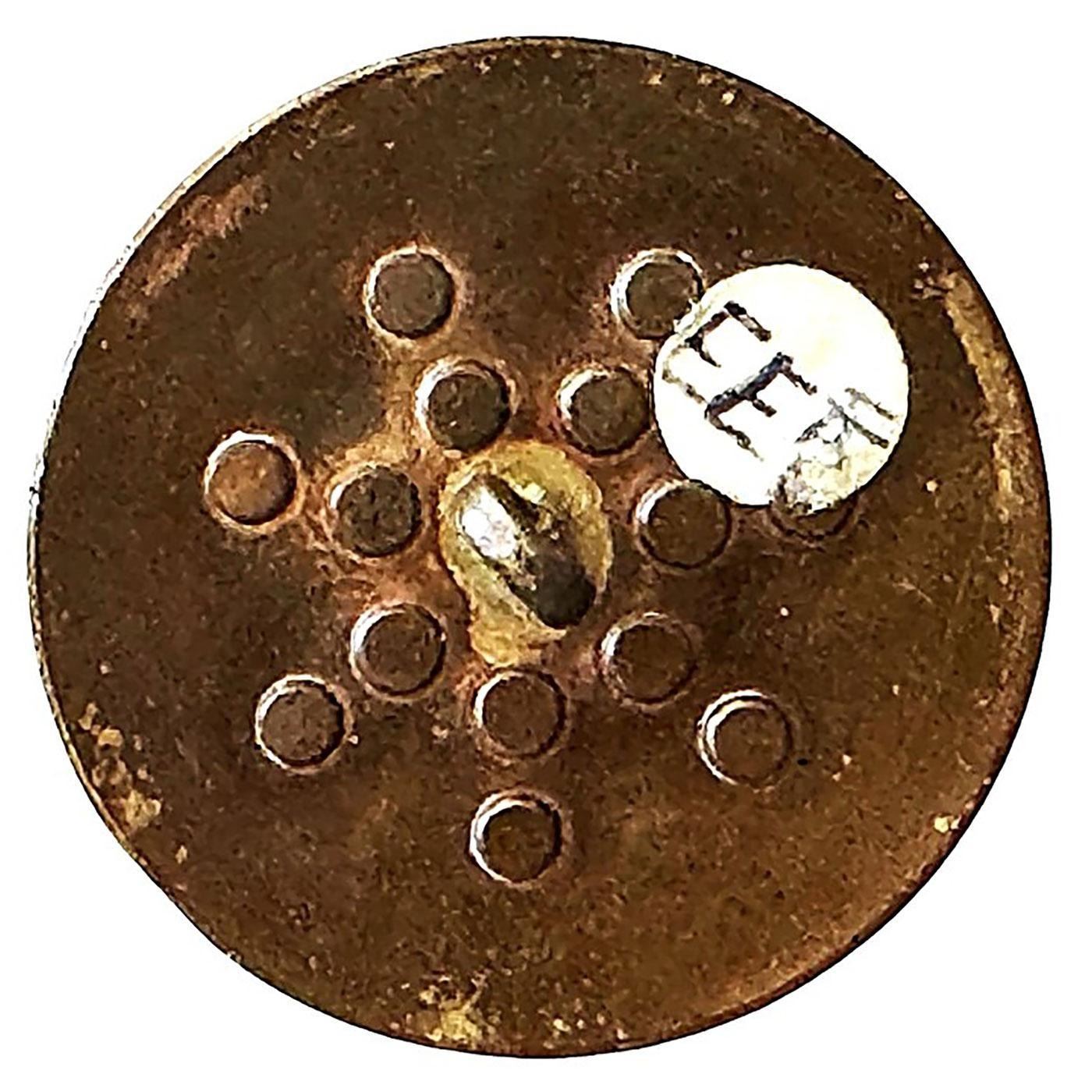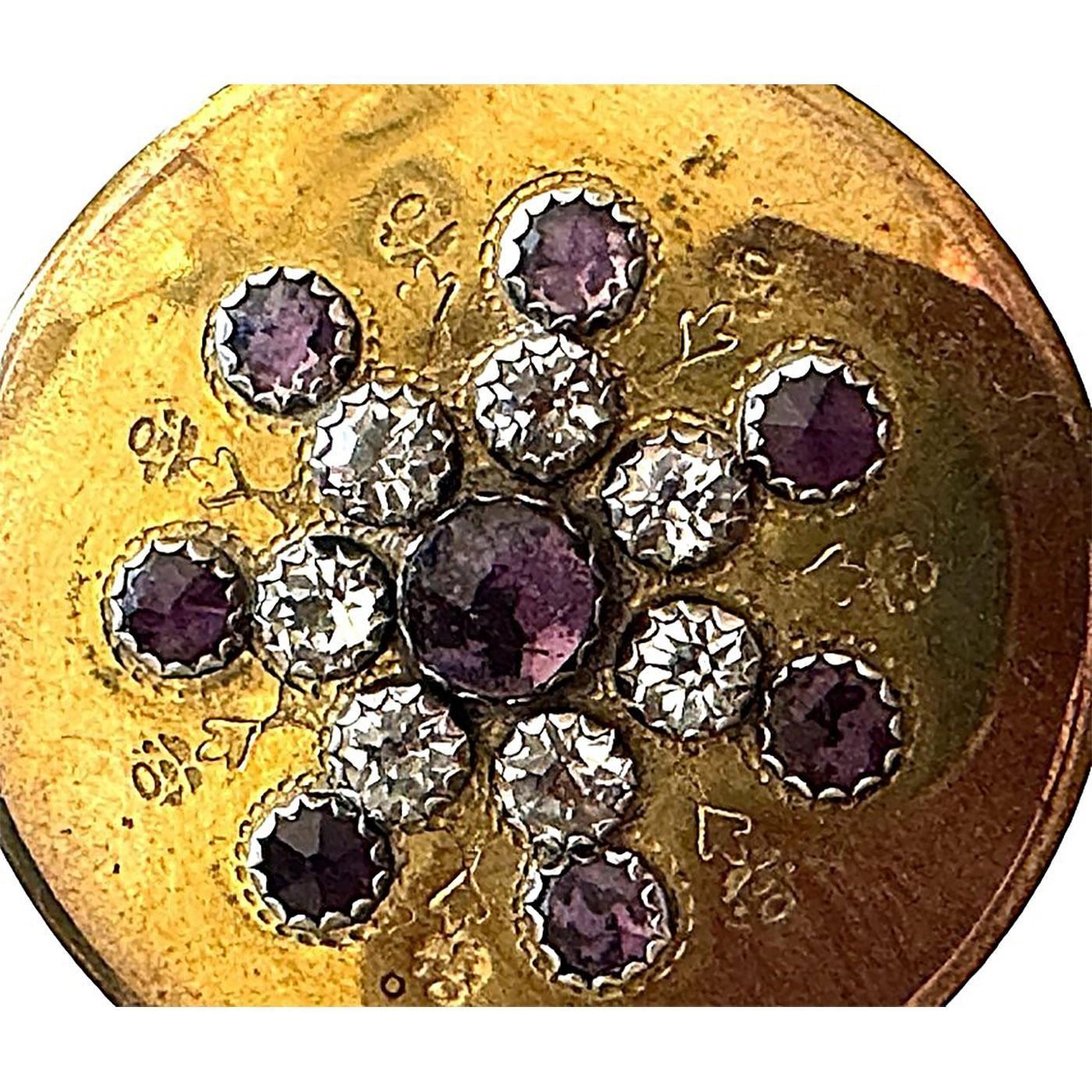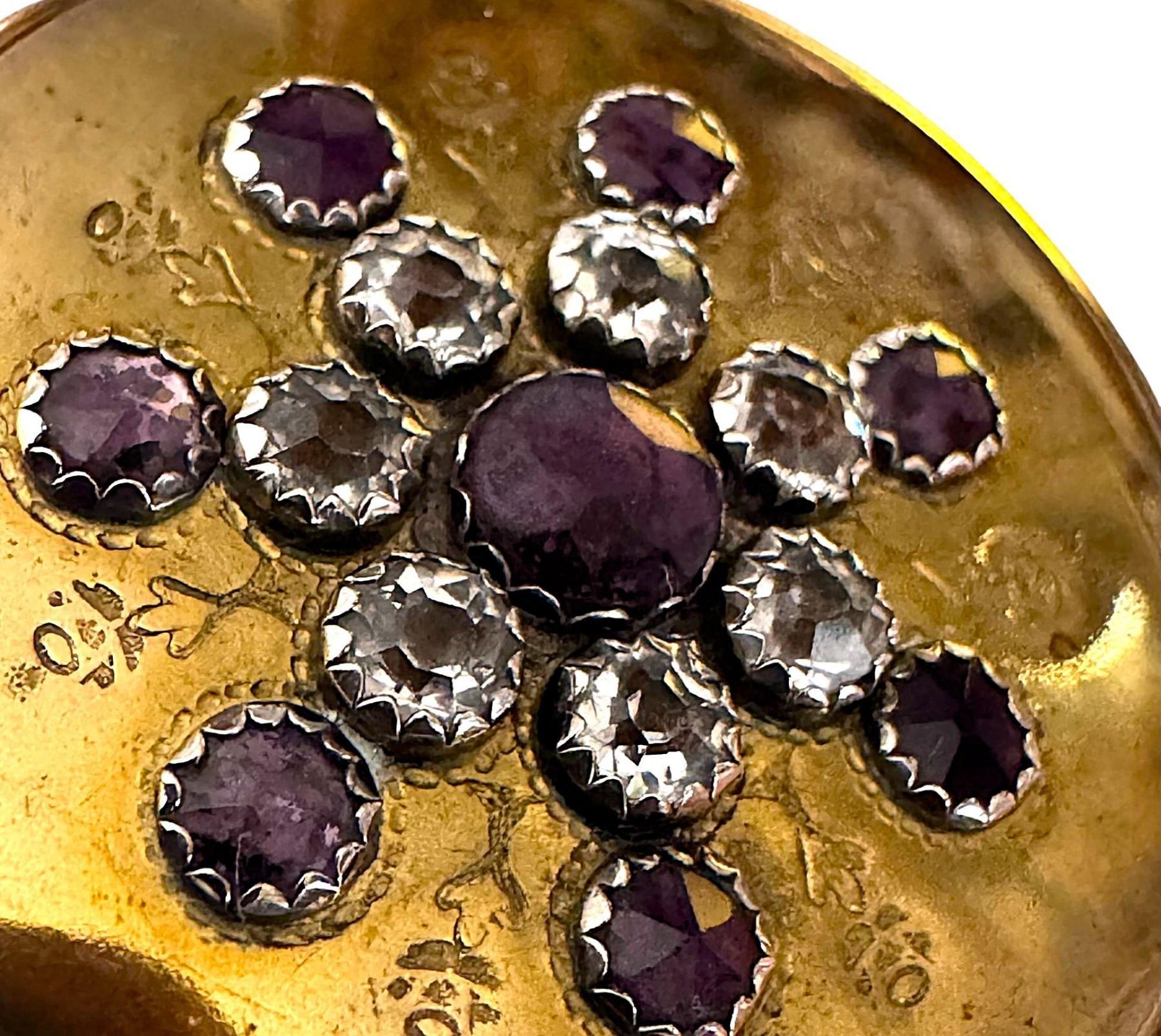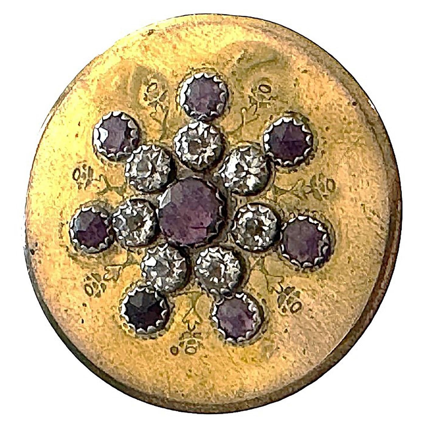 1 Large 18th C. engraved brass coated copper with colored pastes. This is an incredible button from the collection of Harry Case of Missouri who had compiled what many believe was the best ever 18th century copper collection on the world. We have been selling his buttons over the pat two years and this very rare example can now be yours. The button is engraved on the front with an array of small flowers in between the purple and clear pastes. 18th century coppers with this kind of OME is quite rare. Believe it or not many years ago the Page button auction one of these examples, just like this one, and I was actually on the phone to bid, Margaret McBride, (co-owner of Page) asked me did I want to bid $10000, I thought she said $1000 and I said yes, but she repeated the number to me and I said OH, NO. The button sold for $9500 plus the buyers premium bringing the final price with tax to almost $11000. If you don't believe me there are several people that remember this. However I have not seen another example since that time until acquiring Harry's collection for sale. If you want a truly incredible copper button from the 18th century here is your opportunity, that may never come up again.