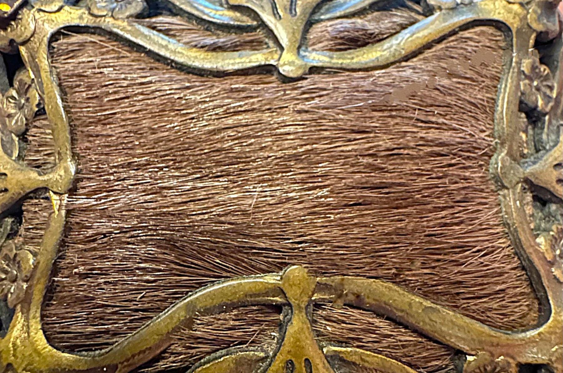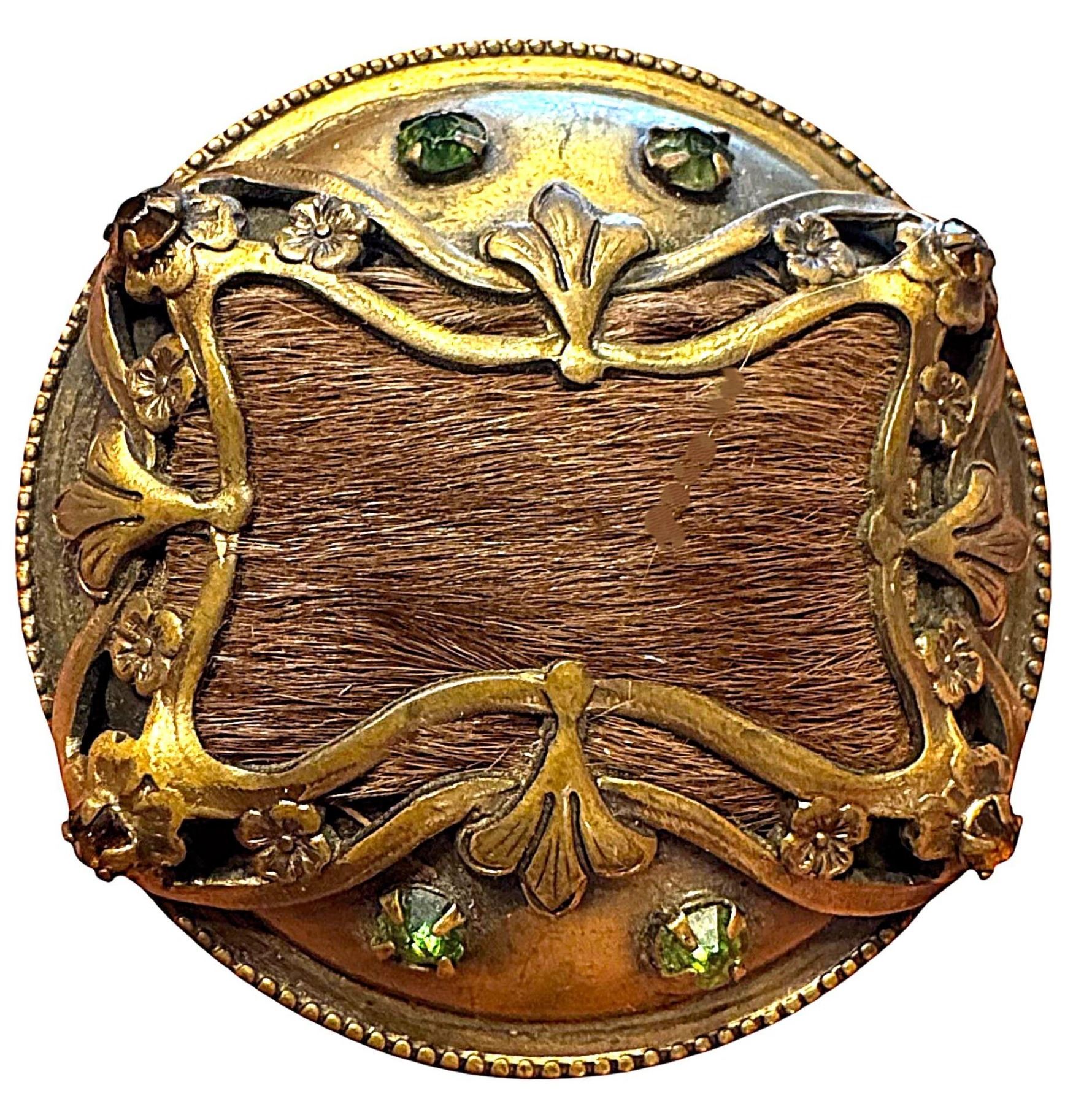 1 Large 19th century hair centered green paste OME example. If you didnt know Nikki Deal of Missouri who was also the past assistant editor of the NBS bulletin, but you have been watching our auctions for the past few auctions, you now have a good feel for how eclectic she was in her collecting of buttons. This example is no exception and it is quite an unusual and RARE button. The center is hair *human or Horse we do not know) and is set into a very ornate Art Nouveau style brass mounting accented with faceted green pastes around the outside. If the center where the hair is was a large glass cabochon this would be a genuine Gay 90 button. Very cool button and in great condition. It was noted on Nikki's card that several seasoned collectors had offered her over time a considerable amount for the button, but she was always reluctant to give it up.