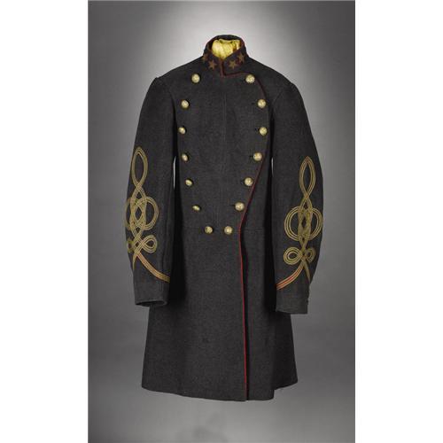 <B>A Very Rare Confederate Colonel's Frock Coat - Colonel John Thompson Brown, 1st Virginia Artillery, killed at the Battle of the Wilderness</B></I><BR> Confederate Colonel's uniforms are more rare than those of Confederate generals. This frock coat was worn by Colonel John Thompson Brown of the 1st Virginia Artillery, the 'Richmond Howitzers'.<BR>This beautiful frock coat has been superbly preserved since Colonel Brown's death on May 5, 1864 at the Battle of the Wilderness. A Union non-commissioned officer, Sergeant Watson from Michigan, removed the coat from Brown's body and took it back home where it had been held in his family until just ten years ago. It was then that a descendant returned the coat to Virginia.<BR> This Confederate frock coat, one of the most rare in existence not only because of the rank signified but also due to its historical significance, is being offered here for the first time at auction.<BR>This Confederate Colonel's artillery frock coat is in cadet gray with a standing collar which has three gilt stars hand-sewn into the red cloth backing and attached to the collar. It has magnificent, unusually large triple-gold braids of quatrefoil that run up each of the sleeves which also indicate Brown's rank as a Colonel. The sleeves are in the Confederate officer's pattern. The double-breasted uniform has eagle staff buttons as well. There are three smaller cuff buttons on each sleeve as well as eagle staff buttons on the coattail. It is trimmed with distinctive artillery red piping on the double-breasted part of the coat, piping that extends to the top of the collar and at the coattails, even at the cuffs.<BR>John Thompson Brown was named captain of the 1st Virginia Artillery, the 'Richmond Howitzers' on July 12, 1861. His Colonel's uniform is an extreme rarity. It is in overall superb condition and is a highly attractive Confederate uniform.<BR><BR><B>Provenance: The Watson Family</B></I><BR><BR><B>The Tharpe Collection of American Military History</B></I><BR><BR><B>Exhibited: The Liberty Heritage Society Museum</B></I><BR><BR><b>Shipping:</b> Requires 3rd Party Shipping (<a target="_blank" href="http://www.heritageauctions.com/common/shipping.php">view shipping information</a>)
