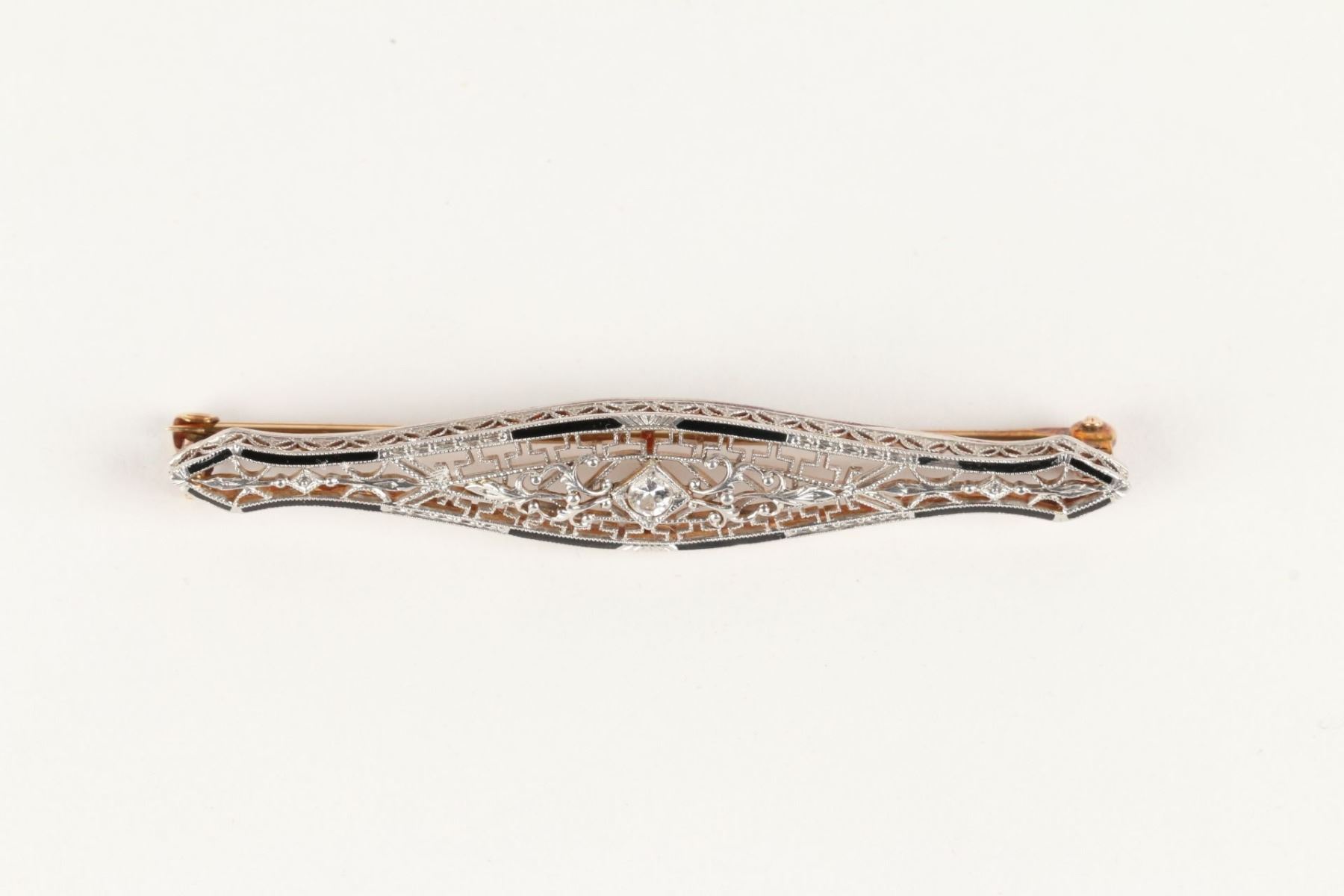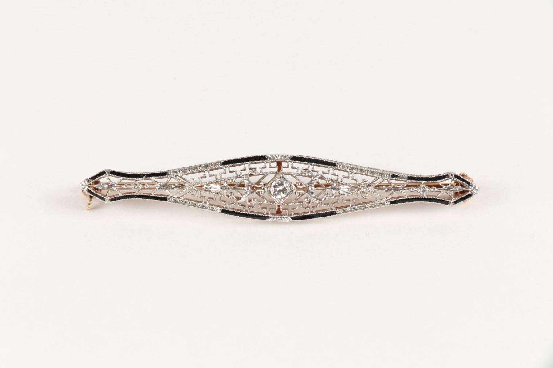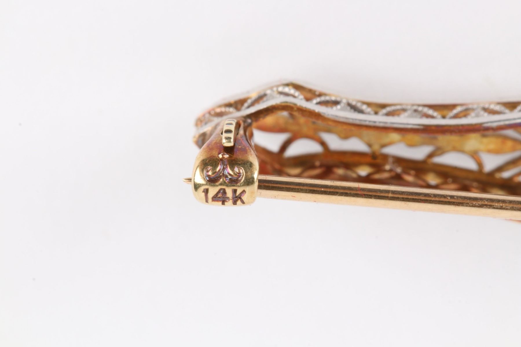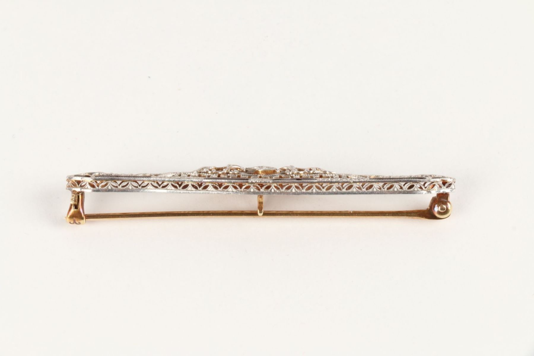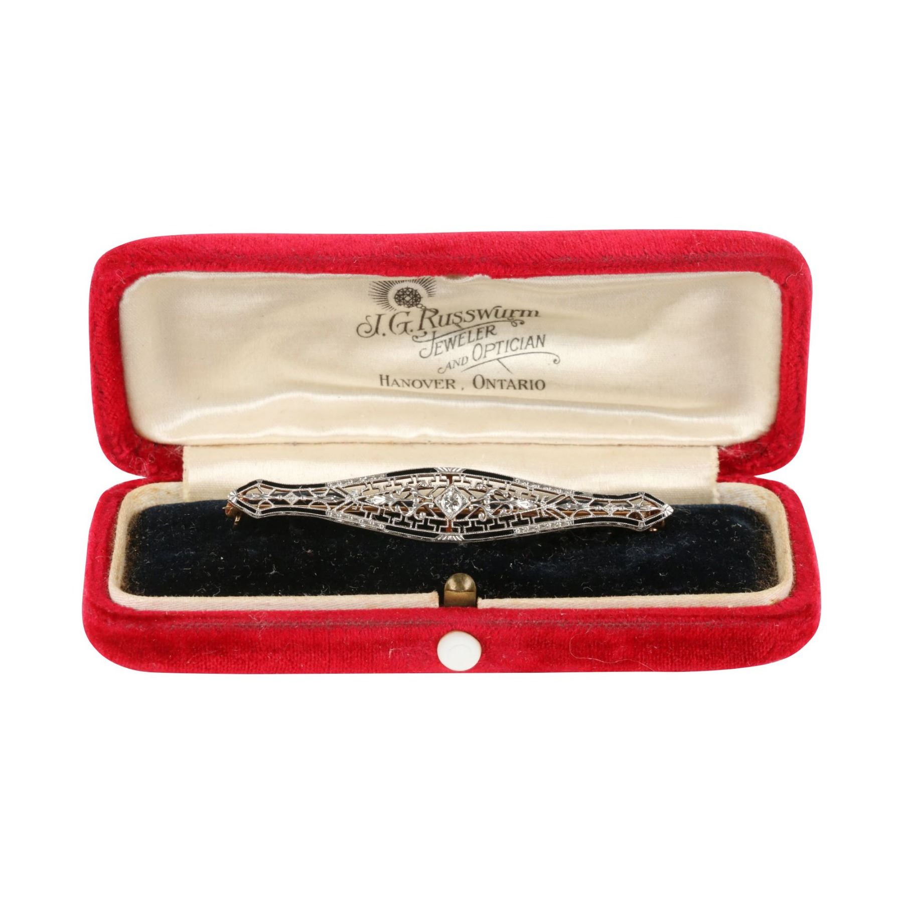 QUANTITY: 1. MEASUREMENTS: 5.08cm. GROSS WEIGHT: 4.00g. NOTES: In original Hanover, Ontario velvet display box. Marked "14K" on clasp at tip of pin. . Est. $150-250.