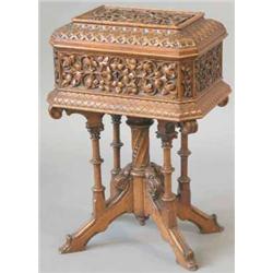 A Victorian Gothic oak teapoy (converted interior) in the manner of Pugin profusely carved with ivy leaves and diaper ground on arched and columned legs, with central spiral fluted column and four leaf carved splayed legs, 1ft.6ins. £900-1,100