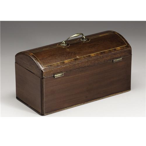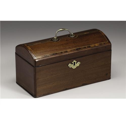<B>A Victorian Mahogany Tea Caddy</B></I><BR><BR>Unknown maker, England<BR>Late Nineteenth Century<BR>Mahogany, satinwood, brass, paper<BR>Unmarked<BR>6 in. high x 10.75 in. wide x 5.12 in. deep<BR><BR>Of domed lid form, the top divided into two rectangular panels outlined in satinwood, brass bail handle and escutcheon; the interior with paper lining to lid and fitted with three compartments with satinwood edged lids topped by turned knobs.<BR> <BR><BR><B>Important notice:</