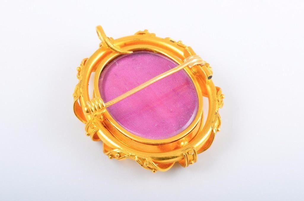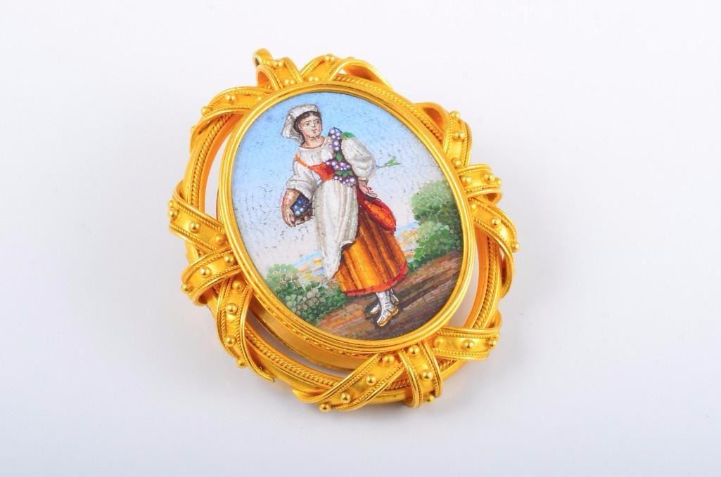 A very beautiful studded ribbon design in 22K yellow gold surrounds thepolished micromosaic depicting a shepherdess or peasant woman; backed with pink fabric and glass, it can be opened for a photo to be inserted; makers mark on pin; length is approximately 2 inches.