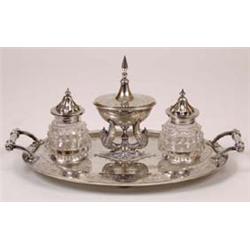 A Victorian Plated Oval Desk Stand, with presentation inscription, the central pot and cover on s...