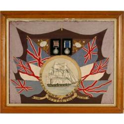 A Victorian Sailorwork Picture, decorated a three masted ship within a garter "HEAVEN LIGHT OUR GUIDE GOD DEFEND THE RIGHT", on a ground of flags, drapes and flowers, applied a China war medal, with Canton 1857 bar, and a long service and good conduct medal awarded to Jn Haverfield Pte 23 Co RMLI, (faded and moth damaged) 54 x 68.5 cm, in a birds eye maple frame See colour illustration £2000-3000