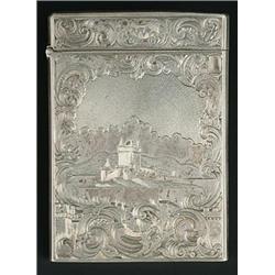 A Victorian Scottish silver card case, the front engraved with a view of Dunegan Castle, Skye, within a surround of foliate scrolls and turrets, the back engine turned and engraved with exotic birds drinking at a fountain, and a cartouche with initials 'MP', with a border of foliate scrolls birds heads and classical pillars, Edinburgh 1850 by James Nasmyth & Co, 9.5 x 7 cm (3.75 x 2.75 in)