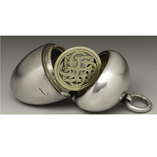 <B>A Victorian Silver Vinaigrette</B></I><BR><BR>Unknown maker, London, England<BR>1873-74<BR>Silver and silver gilt<BR>Marks: (lion passant), (leopard's head), (monarch profile), <I>HWD, S</B></I><BR>1.5 in. long, .82 troy ounces<BR><BR>In the form of an acorn, with silver gilt interior; geometric star pierced grill. With suspension loop.