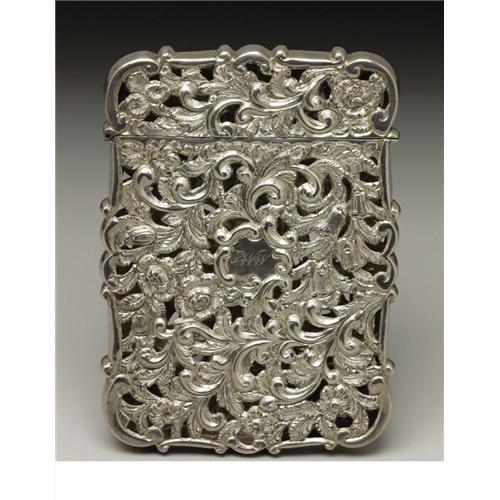 <B>A Victorian Silver Calling Card Case</B></I><BR><BR>Nathaniel Mills, Birmingham, England<BR>1839-40<BR>Silver<BR>Marks: (lion passant), (anchor), (monarch profile), <I>NM, Q</B></I><BR>4 in. long, 2.37 troy ounces<BR><BR>Of shaped rectangular form with reticulated cast floral and scroll decoration, the center with shaped reserve monogrammed <I>IWW.</B></I> In a fitted leather case.