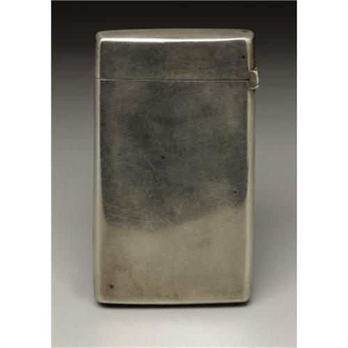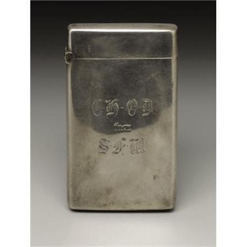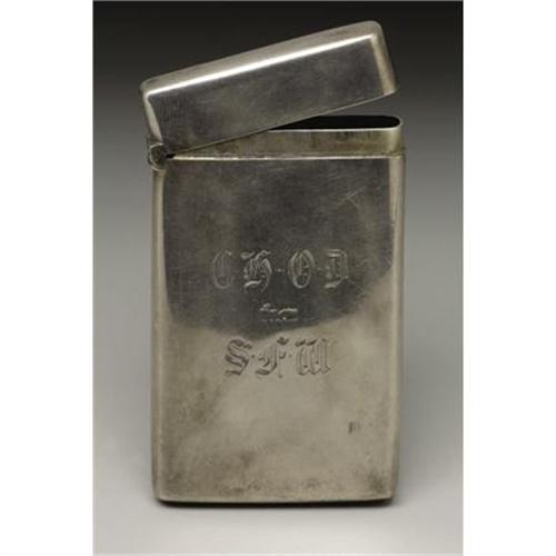 <B>A Victorian Silver Calling Card Case</B></I><BR><BR>Hilliard & Thomason, Birmingham, England<BR>1888-89<BR>Silver and silver gilt<BR>Marks: (lion passant), (anchor), (monarch profile), <I>H&T, o</B></I><BR>3.25 in. long, 1.73 troy ounces<BR><BR>Of plain rectangular form, engraved <I>CK OD from SFW.</B></I> Silver gilt interior. In a fitted leather case.<BR><BR><b>Shipping:</b> Requires 3rd Party Shipping (<a target="_blank" href="http://www.heritageauctions.com/common/shipping.php">view shipping information</a>)