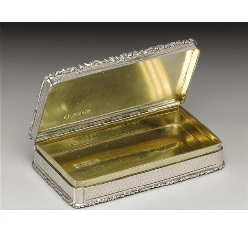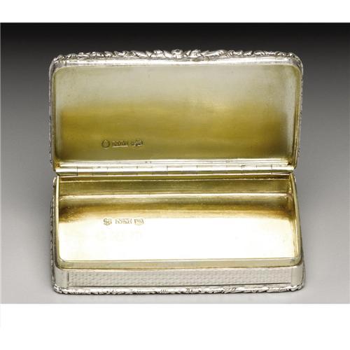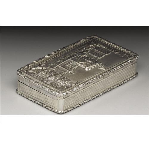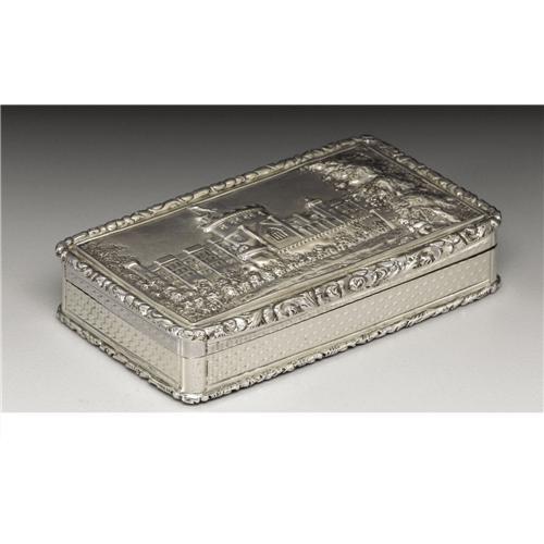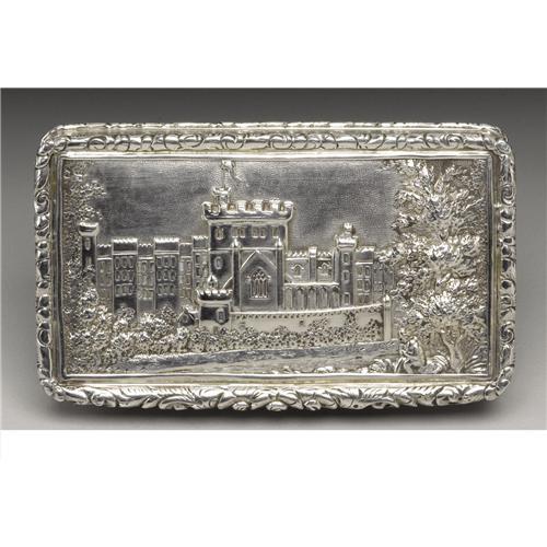 <B>A Victorian Silver Castle-top Snuff Box</B></I><BR><BR>Nathaniel Mills, Birmingham, England<BR>1837-38<BR>Silver and silver gilt<BR>Marks: (lion passant), (anchor), (George IV profile), <I>N.M, O</B></I><BR>2.81 in. long, 2.28 troy ounces<BR><BR>The top embossed with a view of Windsor Castle; cast scroll borders and engine turned decoration. Silver gilt interior.<BR>