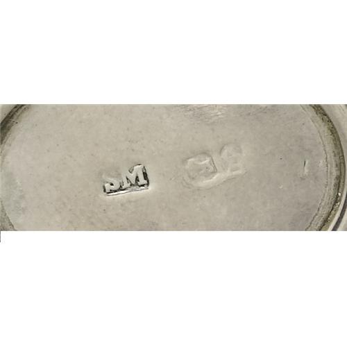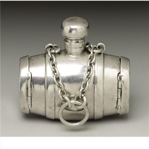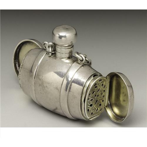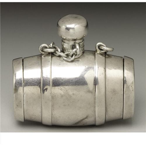 <B>A Victorian Silver Combination Vinaigrette, Pill Box and Scent Bottle</B></I><BR><BR>S. Mordan & Co., London, England<BR>1873-74<BR>Silver and silver gilt<BR>Marks: (lion passant), (leopard's head), (monarch profile), <I>SM, S MORDAN & CO., S</B></I><BR>1.87 in. long, 2.09 troy ounces<BR><BR>In the form of a banded barrel, one end opening to reveal a vinaigrette with silver gilt interior and scroll pierced grill; the other end opening to reveal a pill compartment with silver gilt interior. Knob on top opening to center section scent bottle. On a suspending chain.