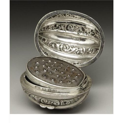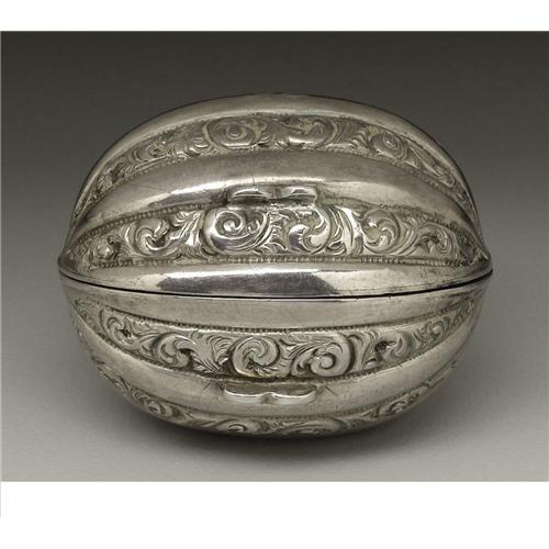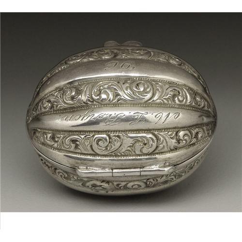 <B>A Victorian Silver Nutmeg Grater</B></I><BR><BR>Hilliard & Thomason, Birmingham, England<BR>1895-96<BR>Silver and steel<BR>Marks: (lion passant), (anchor), <I>H&T, v</B></I><BR>1.62 in. long<BR><BR>Of melon form with alternating bands engraved with foliate scrolls; hinged steel grater.